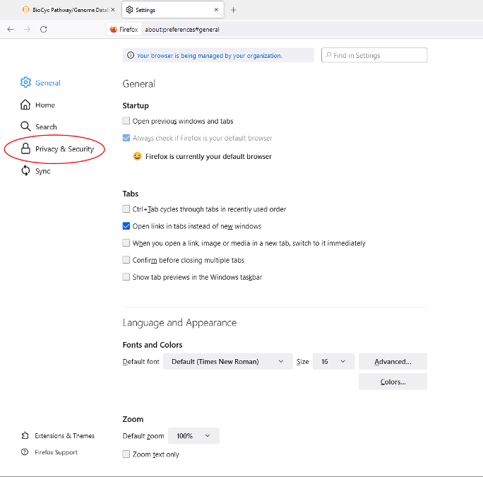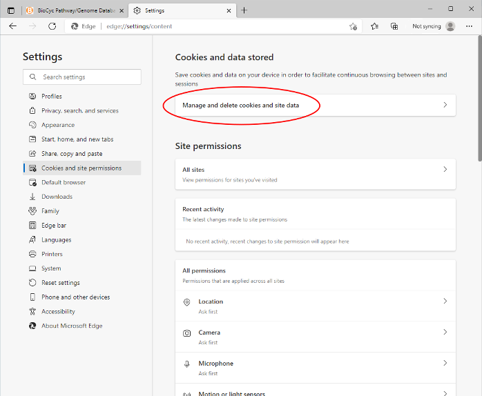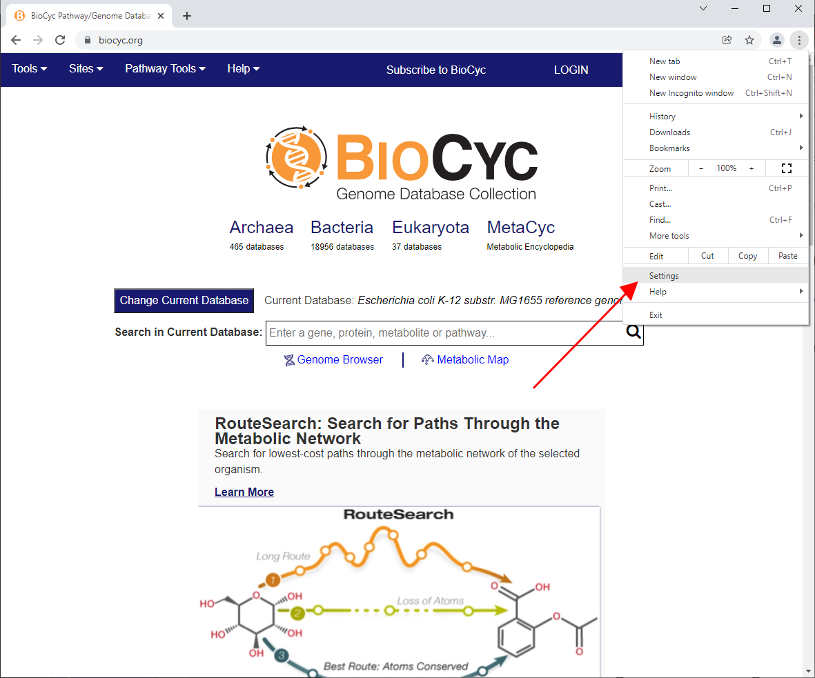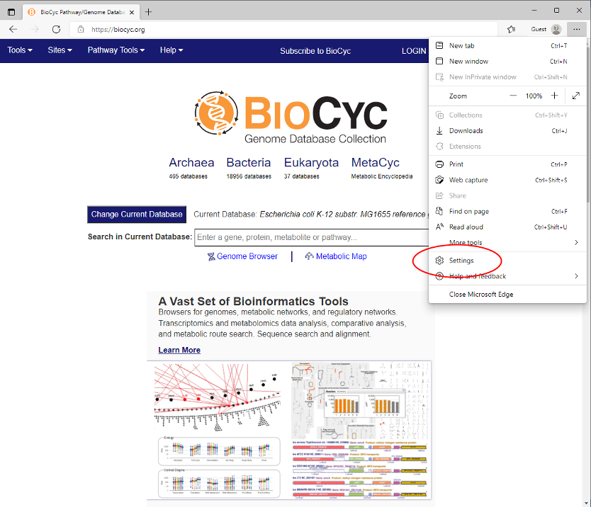 - Go to biocyc.org (or ecocyc.org etc) in Edge and click on the three dots button and then select "Settings"
