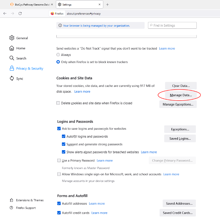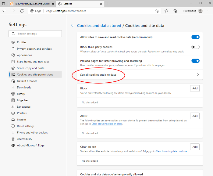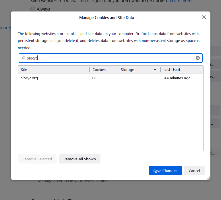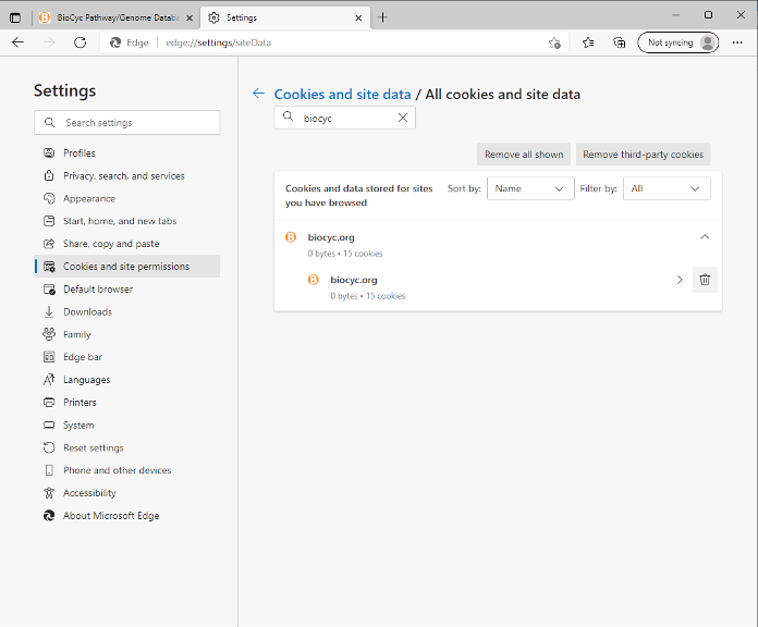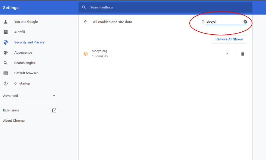- In the "Search cookies" text box, type "biocyc" (or "ecocyc" etc). You need to do this for each site.